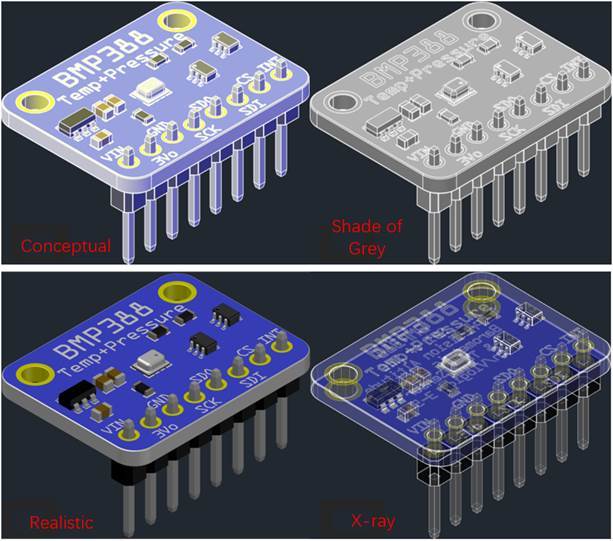 La eficiencia de visualización de los modelos 3D de ZWCAD con los cuatro nuevos estilos visuales. Conceptual, Gama de grises, Realista, Radiografía.